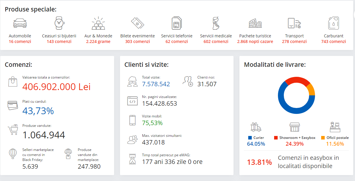 Am aruncat o privire şi în panoul eMAG şi am descoperit că valoarea totală a comenzilor este de 406.902.000 lei în jurul orei 17. Că modalităţi de livrare, lumea a ales curier în proporţie de 64.05%, showroom şi Easybox în proporţie de 24.39% şi oficii poştale în proporţie de 11.56%. Top 10 comenzi includ Bucureştiul pe primele 3 locuri ca valoare, apoi Ploieşti, Alba Iulia şi Bistriţa.