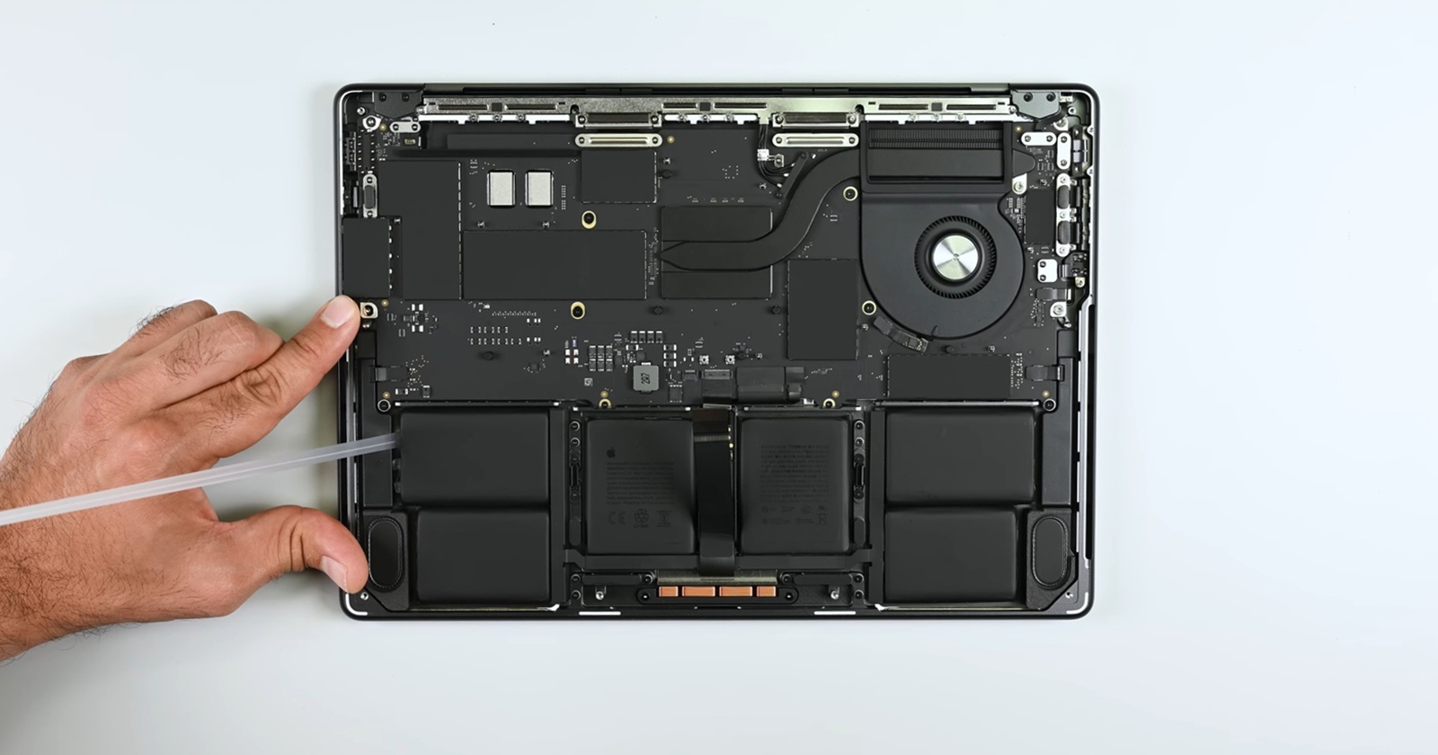 Începem cu ce e pozitiv: Apple a lansat ghiduri oficiale de reparații pentru acest model încă din prima zi. De asemenea, iFixit a apreciat faptul că toate benzile adezive ale bateriei sunt acum accesibile fără a fi nevoie să scoți trackpadul. Bateria, o unitate de 72,6 Wh (ușor peste modelul anterior de 72,4 Wh), rămâne totuși greu de înlocuit.