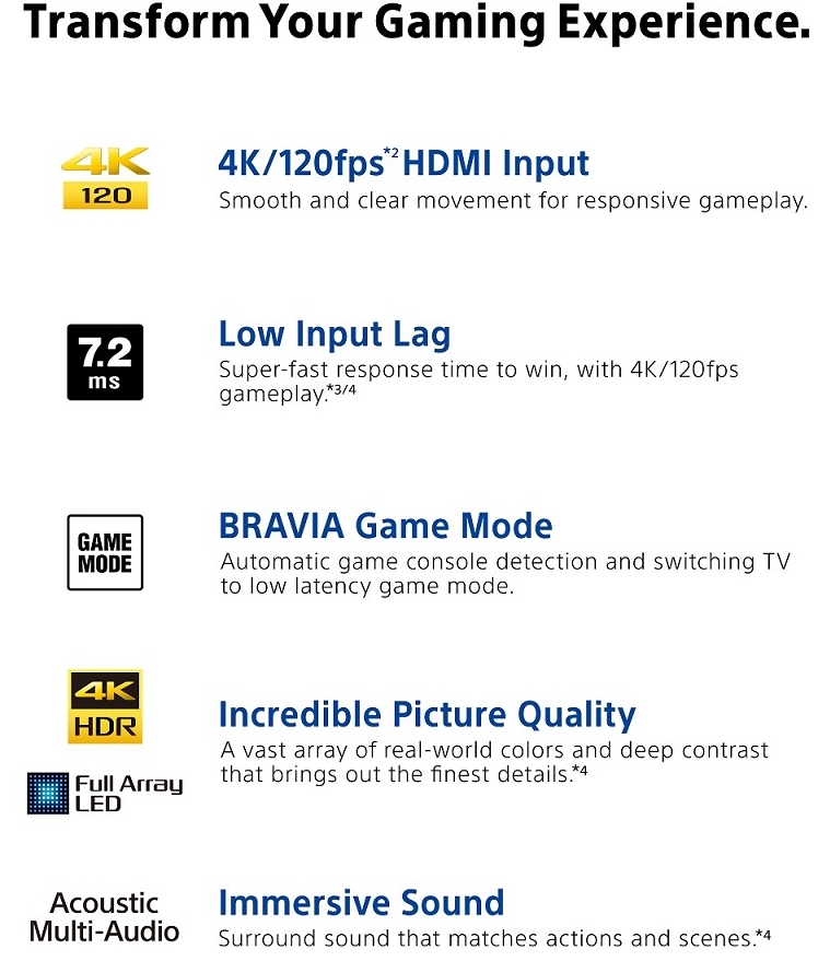 Ambele televizoare vor oferi experiențe de gaming extrem de fluide, alături de consola PS4. Sony a declarat că "Perfect pentru PlayStation 5" înseamnă și că modelele de televizoare dispun de funcția Game Mode a BRAVIA, care permite utilizatorilor să experimenteze jocuri pe consola PS5 în mod automat cu latență scăzută.