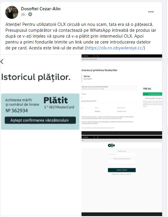 În imaginea de mai sus avem postarea lui Cezar, care ne-a împărtășit experiența tatălui său. Link-ul la care trebuie să fim atenți este o copie a site-ului OLX. La accesarea acestuia se solicită introducerea datelor confidențiale.