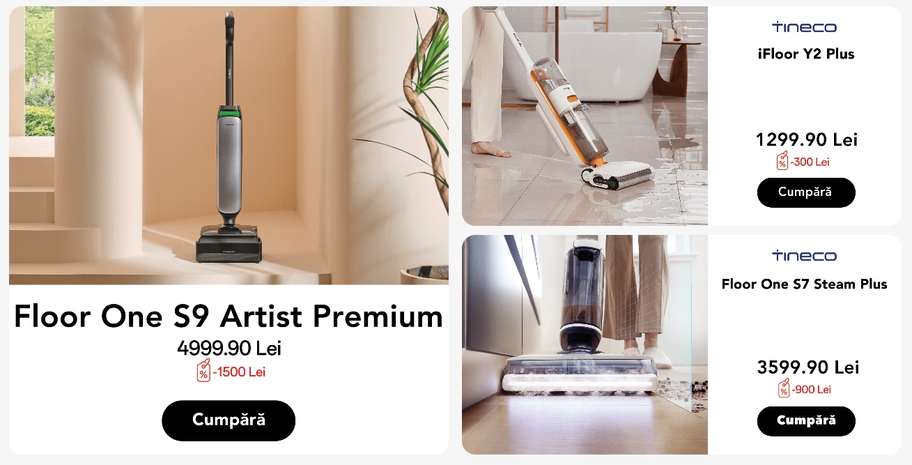 - Tineco Floor One S7 Steam Plus – singurul aspirator de pe piață care aspiră, spală și dezinfectează cu abur simultan, are o reducere de 900 lei.