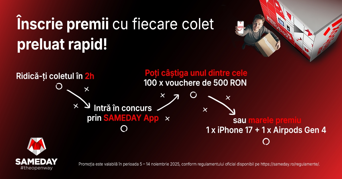 Sunt 10 zile de concurs, 11 câștigători și avem și premii tentante precum 100x vouchere în valoare nominală de 500 lei și marele premium un iPhone 17 și o pereche de căști wireless AirPods Gen4. Concursul are loc în perioada 5 - 14 noiembrie 2025, iar regulamentul oficial va fi disponibil chiar aici.