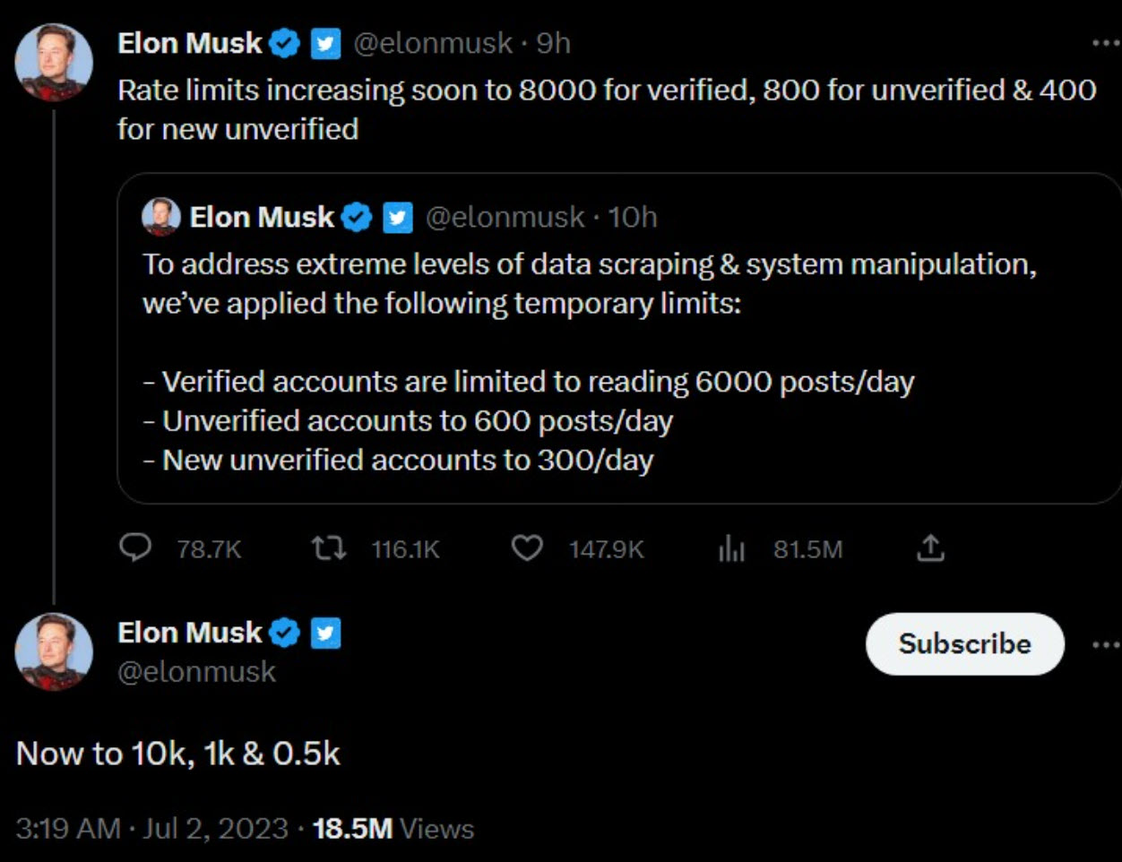 Iniţial Musk a glumit şi a spus că face o faptă bună pentru oamenii dependenţi de Twitter, care au nevoie să mai iasă din case. De fapt Twitter ar fi avut probleme de funcţionare sâmbătă, pe 1 iulie 2023, iar gurile rele spun că ar fi avut ceva probleme cu spaţiul de stocare din cloud-ul Amazon de fapt. Limitarea impusă de Elon iniţial era ca un utilizator neverificat să poată citi până la 600 de postări pe zi, iar utilizatorii noi cu conturi neverificate doar 300 de postări pe zi.