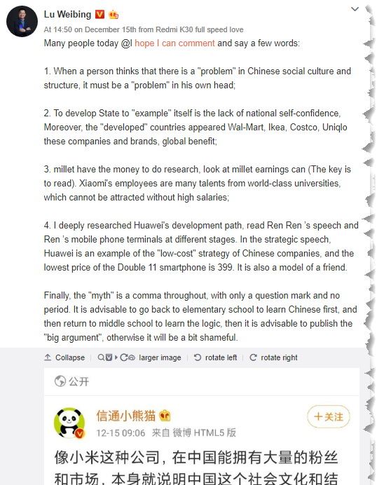 Vicepreşedintele Xiaomi a replicat că "dacă dai ţările dezvoltate ca exemplu înseamnă că nu ai încredere în ţara ta" şi a amintit că ţările acelea dezvoltate au produs branduri ca Walmart, IKEA, Costco şi UNIQLO, care oferă beneficii globale la sume accesibile. Între timp au postat şi reprezentaţi PR Xiaomi, care au amintit că şi Huawei a pornit la drum tot cu telefoane ieftine. Între timp bloggerul şi-a şters postarea şi a scris o altă în care scrie că susţine Xiaomi şi alte companii de gen în "creşterea puterii ţării sale".