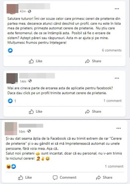 Sunt oameni care se scuză cu privire la cererile trimise în mod întâmplător, iar alți utilizatori se amuză de acest nou „feature” Facebook. Alt fenomen bizar e că nu poți șterge prietenii proaspăt ajunși în lista ta. Astfel, pare că va trebui să ne împăcăm, cel puțin pe moment, cu ideea. Mă gândesc că Meta încearcă să rezolve acest bug cât mai rapid, având în vedere că există riscul de a pierde mulți utilizatori.