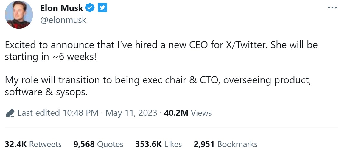 Elon Musk a achiziționat Twitter la finalul anului trecut, sosind pe poziția de CEO a rețelei de socializare din luna octombrie a anului 2022. Anterior miliardarul „glumea” pe seama faptului că va renunța la poziția sa de director executiv. Ei bine, până la urmă pare că vestea e mai reală decât s-ar fi așteptat majoritatea utilizatorilor. Musk a anunțat recent că a angajat un nou CEO pentru Twitter. Este vorba despre o „ea”, aparent, iar tranziția va avea loc în aproximativ 6 săptămâni. Detalii avem mai jos.