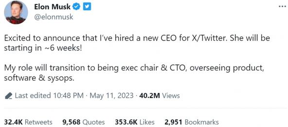 Musk a spus că va respecta rezultatul sondajului, spunând însă că va demisiona din funcția de CEO de îndată ce va găsi pe cineva „suficient de nebun pentru a accepta postul”. Publicația Financial Times susține că noul CEO al rețelei de socializare ar putea fi Linda Yaccarino.