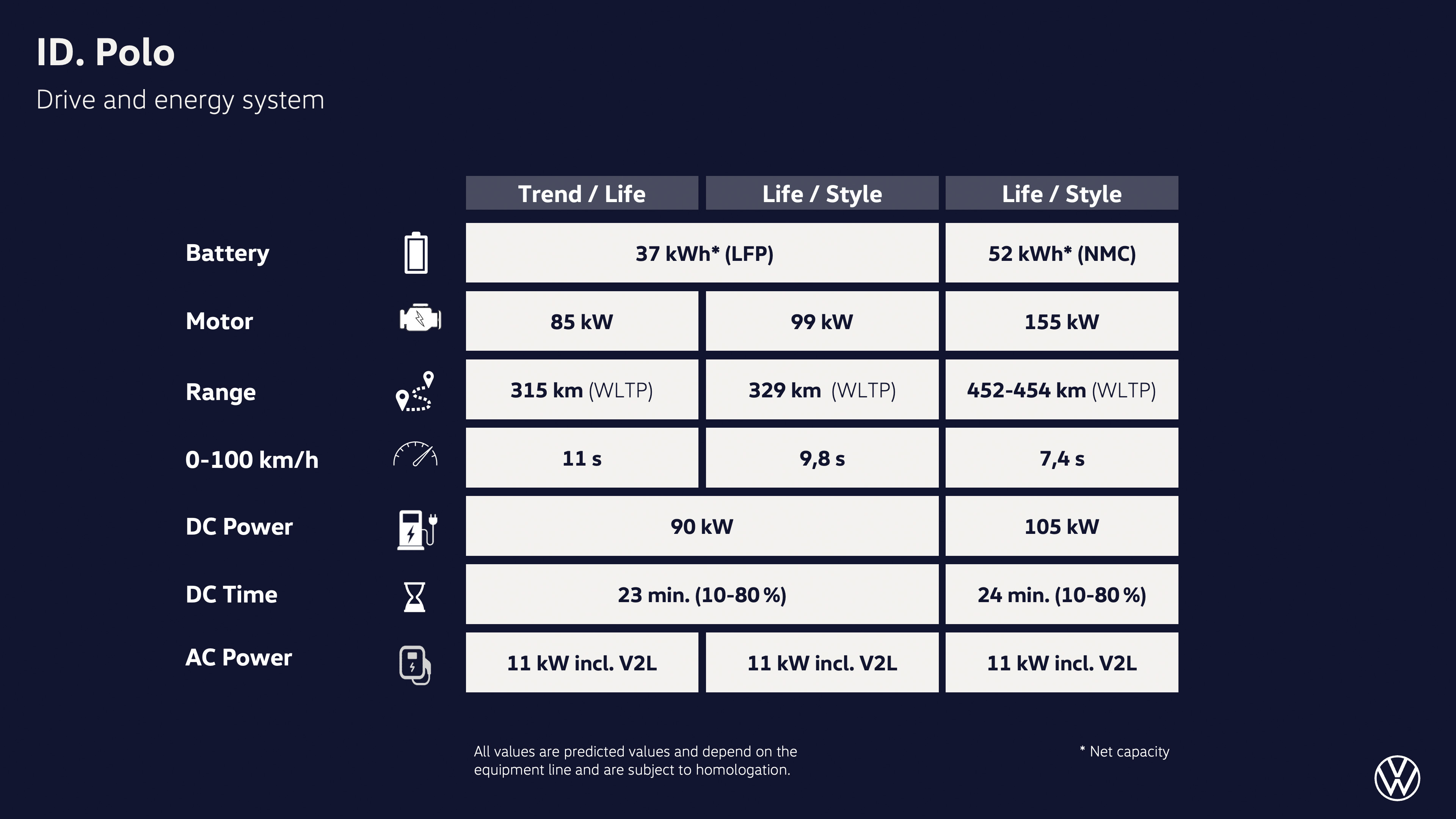 Va avea un preț de pornire de24995 euro în Germania și promite un range WLTP de 454 km. Asistăm iată la intrarea celui mai bine vândut VW în epoca electrificării. Sunt 3 echipări oferite, toate cu tracțiune față și suport pentru alimentare rapidă. Avem variantele Trend/Life și Life/Style cu baterii de 37 kWh și putere de 85 kW, respectiv 99kW. Ca autonomie oferă 315 km, respectiv 329 km, iar varianta superioară ajunge la 0-100 km/h în 9.8 secunde.