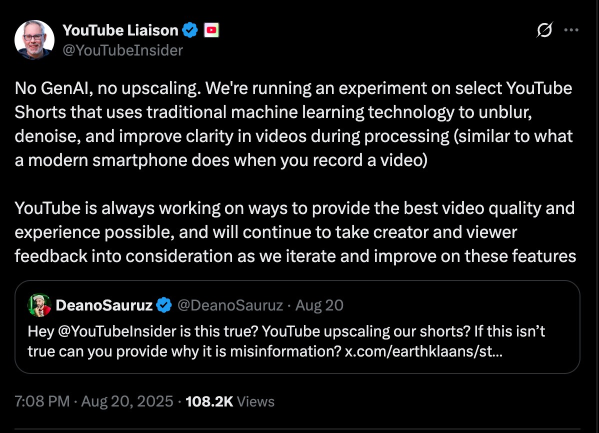 Într-o reacție oficială, purtătorul de cuvânt Rene Ritchie a admis că YouTube derulează un test restrâns în care videoclipurile Shorts sunt procesate automat, într-un mod similar cu ceea ce fac camerele telefoanelor moderne. Compania a insistat că nu e implicată AI generativă, dar nu a precizat exact ce utilizatori sunt incluși în test, nici dacă există opțiunea de renunțare.