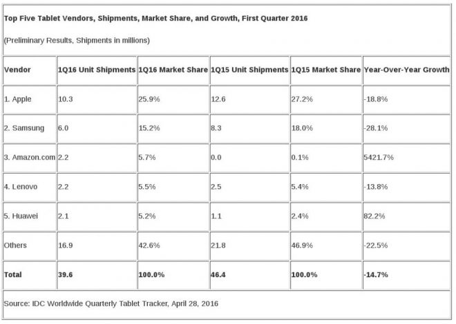 Piaţa globală a tabletelor a însemnat în primul trimestru din 2016 - 39.6 milioane de modele livrate, în scădere cu 14.7% faţă de cele 46.4 milioane de anul trecut. Apple rămâne pe primul loc, cu 10.3 milioane de unităţi livrate, în picaj faţă de cele 12.6 milioane din 2015. Pe 2 se afla Samsung, cu 6 milioane şi pe 3 Amazon, cu 2.2 milioane.