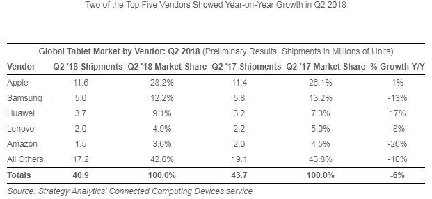 Livrările globale de tablete sunt în picaj de ceva vreme, iar în intervalul aprilie-iunie au ajuns la doar 40.9 milioane de unităţi. Şi aceasta este o scădere, cu 6% faţă de aceeaşi perioadă din 2017. După 14 trimestre consecutive de picaj, câteva firme continuă să o ducă bine, în mod surprinzător. Două dintre companiile de top 5 din lume au reuşit să îşi crească livrările, iar campionul de pe locul întâi a obţinut o creştere cu doar 1% faţă de 2017.
