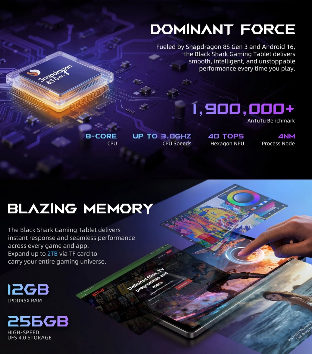 Mai precis pe site-ul celor de la Black Shark, cel global chiar. Tableta are un nume nu chiar inspirat: Black Shark Gaming Tablet şi vine cu un procesor destul de modest, midrange, Snapdragon 8s Gen3. Are 2 ani acest cipset, dar e OK pentru majoritatea jocurilor. Tableta vine şi cu 12 GB RAM LPDDR5X, 256 GB stocare UFS 4.0 şi un ecran de 8.8 inch cu rezoluţie 2K şi refresh rate de 144 Hz.