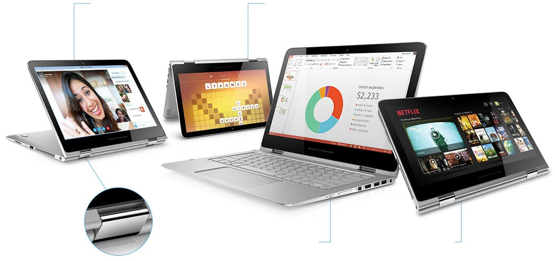 Aceste notebookuri se vor vinde cu procesoare Intel Core i5 sau i7 de generaţie a şasea şi cu SSD-uri de până la 512 GB. Conectori USB 3.0 şi USB Type C se afla la bord, plus mini display port şi HDMI. Preţul de pornire pentru modelul de 15.6 inch este de 1149 dolari. Varianta OLED de 13.3 inch a lui HP Spectre x360 soseşte la primăvară, cu până la 1 TB stocare SSD.