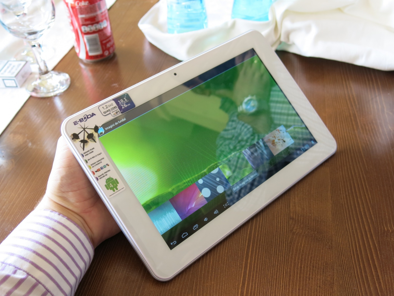 Tableta este destul de grea și groasă. Nu-i un device slim. Nu s-a dorit a impresiona din acest punct de vedere. Partea de touch nu-i pusă direct pe display și există un spațiu destul de mare între sticla cu touch și display-ul propriu-zis. Pe spate am dat de un aspect lucios inedit. Cred că s-a aplicat un fel de folie pe spate astfel încât am avut impresia că va trebui să o înlătur ca să văd spatele device-ului.