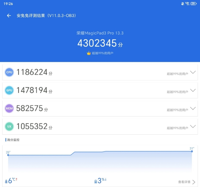 Această tabletă reușește să doboare recorduri în AnTuTu v11, obținând un scor de 4.302.345 puncte, iar secretul său pare a fi sistemul de răcire. Vedem că după rularea benchmark-ului (15-20 minute), ajunge la o temperatură maximă de 31 de grade care sună excelent. Ce aș ține să punctez aici este că avem varianta 11.0 de benchmark, care în comparație cu v10 livrează cu 100.000-150.000 mai multe puncte.