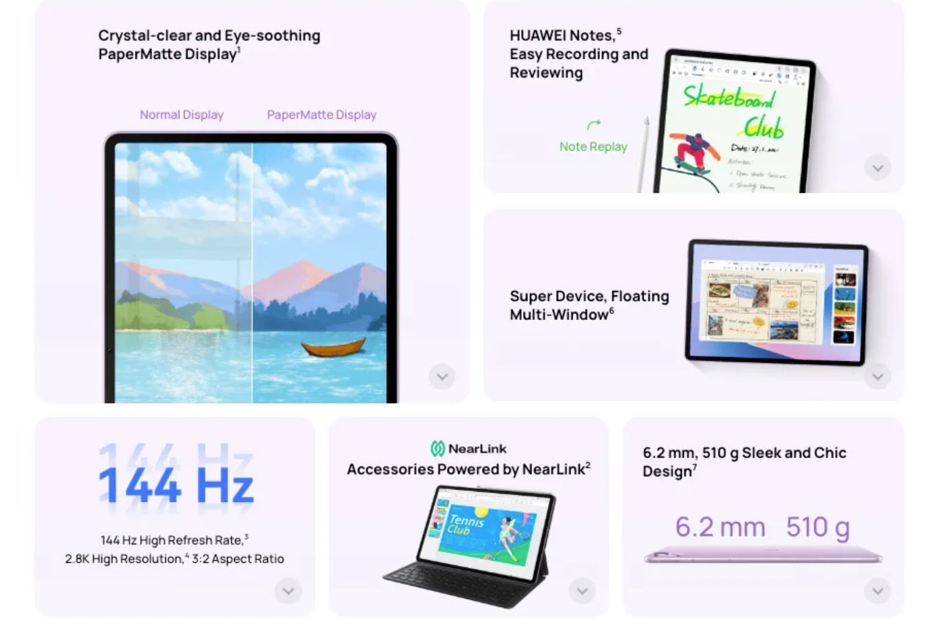 Produsul măsoară doar 6.1 mm în talie şi cântăreşte 515 grame. Vine cu corp metalic, 12 GB RAM, 256 sau 512 GB stocare şi o baterie de 8800 mAh. Rulează HarmonyOS 4.3 şi are AI pentru recunoaştere a ecuaţiilor în Huawei Notes, corecţie a scrisului de mână, dar şi GoPaint pentru desenat şi creativitate. Suportă stylusul M-Pencil Pro.