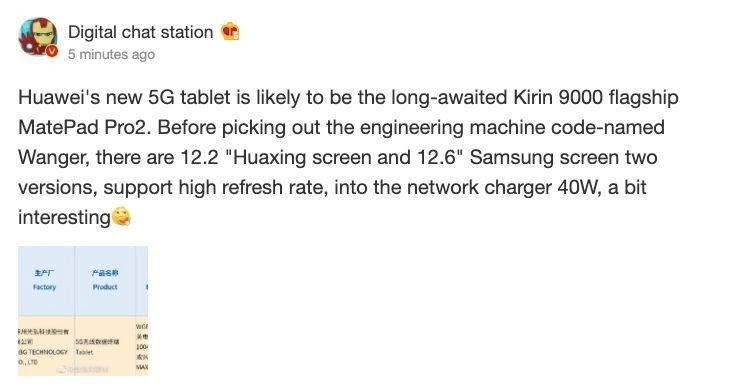 Pentru început terminalul a primit certificarea autorităţii chineze 3C, cu numele de cod WGR-AN19. Listarea confirmă faptul că tableta are suport 5G şi oferă încărcare la 40W. Din păcate nu avem şi alte specificaţii, dar aici intră în acţiune zvonacii de pe Weibo. Ei afirmă că tableta va sosi cu procesor Kirin 9000, acelaşi CPU de pe Huawei Mate 40 Pro şi probabil şi de pe P50 Pro.