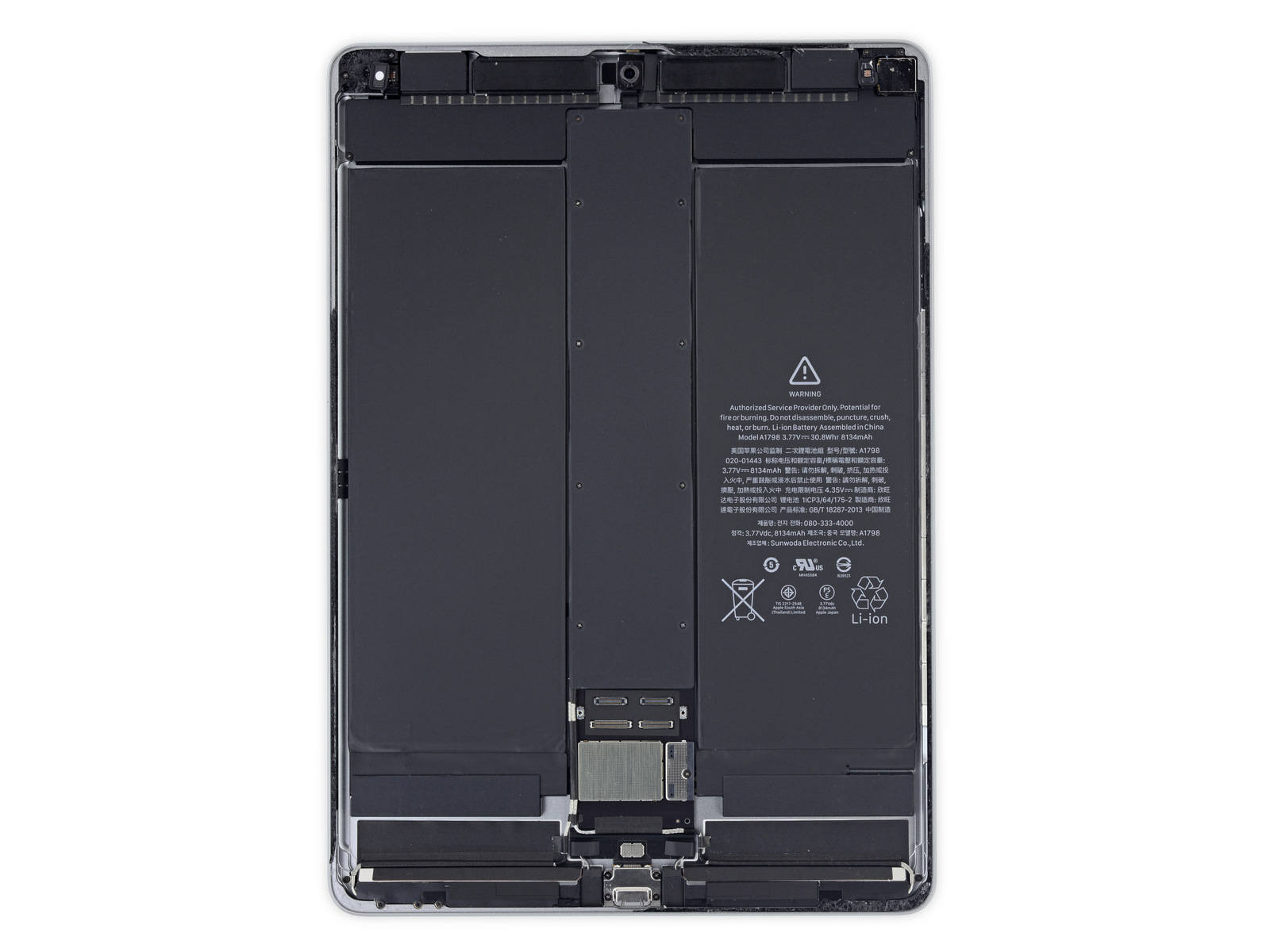 Se pare că acest device are foarte multe în comun cu iPad Pro 12.9 inch din 2015, la capitolul componente. Am fi tentaţi să spunem că a reciclat din ele chiar. Pe de altă parte iPad Pro 9.7 avea dotări foarte similare cu iPad-urile de 9.7 inch dinaintea sa. Una dintre modificările aduse de iPad Pro de 10.5 inch este faptul că avem un cablu care conectează ecranul la placa de bază plasată în zona inferioară şi centrală. Astfel dispare riscul de a îl tăia din greşeală în vreme ce deschidem tableta.