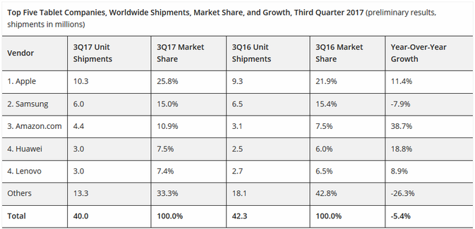 S-au comercializat astfel numai 40 milioane de tablete în trimestru 3 din 2017, asta în vreme ce fix în același interval din 2016 se cumpărau 42,3 milioane de unități. În continuare Apple este compania cu cele mai mari vânzări în acest segment de pe piață, livrând peste 10 milioane de tablete în Q3 2017.