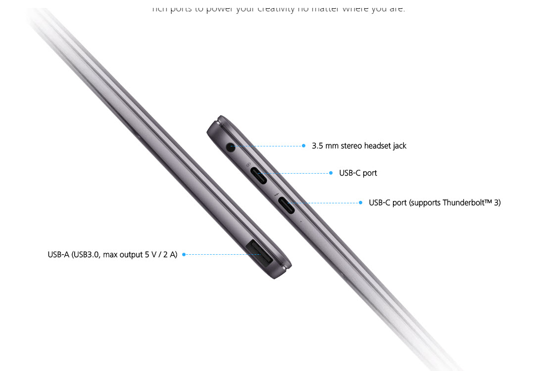 E surprinzător că acest laptop cântăreşte doar 1.33 kilograme şi e şi foarte subţire, cu câţiva milimetri faţă de predecesor. Ajunge la 14.6 mm în cel mai gros punct al său, fiind şi mai subţire decât MacBook Pro. Bateria să de 57.4 Whr promite 12 ore de playback video. Huawei a integrat aici 4 difuzoare şi 4 microfoane, pentru a se asigura că avem şi audiţie şi captură la 360 de grade.
