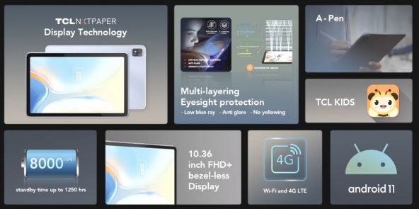 Tableta vine cu un display de 10.36 inch în diagonală și are rezoluție Full HD+. Se pare că acest panou este făcut să arate și să se simtă ca o foaie de hârtie, TCL spunând că e foarte confortabil atât în cazul scrisului și al desenatului, cât și când vine vorba de citit. Dispozitivul rulează Android 11 și vine cu funcția TCL Kids, un mod conceput special pentru copii ce le oferă acces celor mici la conținut educativ.
