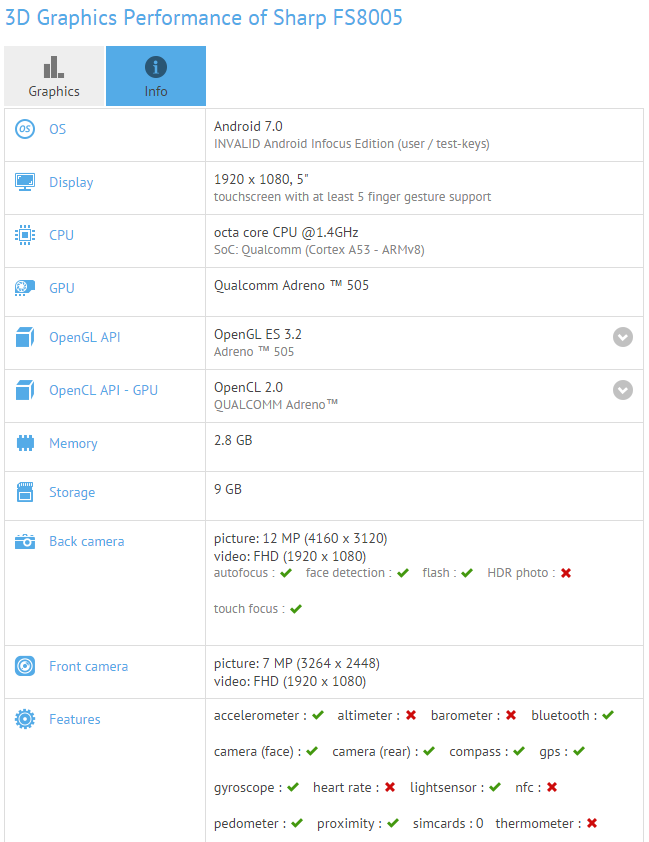 De asemenea, se menționează că rezoluția oferită de ecran este de 1920 x 1080 pixeli, și nu 1920 x 1200 pixeli precum ar fi trebuit de fapt pe o tabletă. Este posibil ca acest benchmark să nu ofere rezultate tocmai precise, și asta pentru că acum doar câteva zile a fost listat și smartphone-ul Sharp FS8005 - model despre care se crede faptul că va ajunge pe piață sub branding Nokia. Avem fix aceleași dotări aici, dar display-ul este unul de 5 inch în schimb.