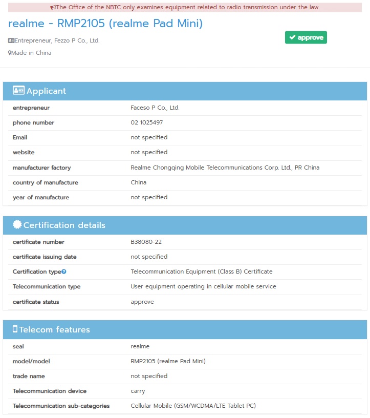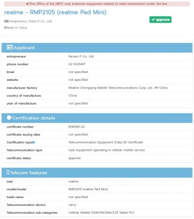Tableta a primit și certificarea Camera FV-5 și am aflat astfel că ea vine cu o cameră principală de 8 MP în spate, cu deschidere f/1.8 și una de 5 MP în față pentru selfie-uri și videoconferințe. Din păcate, nu au fost dezvăluite alte detalii cu privire la acest nou dispozitiv realme.