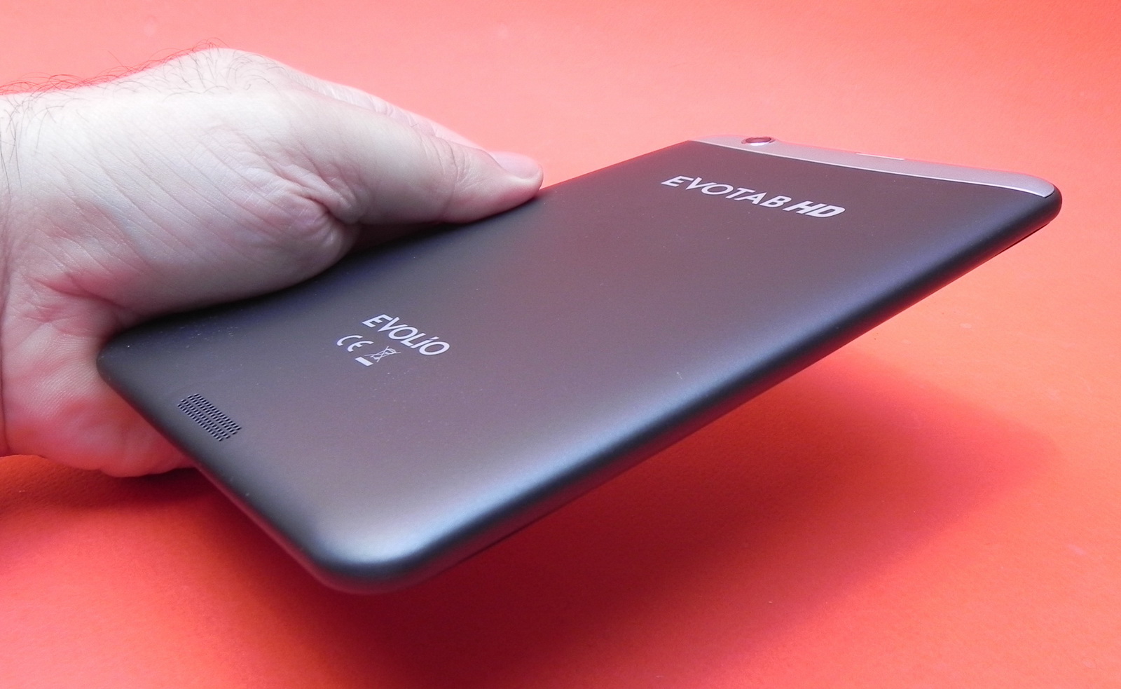La capitolul design beneficiem de un spate soft touch, iar lookul acestui device îmi amintește ușor de tableta Huawei MediaPad. Tableta are porturile și slot-urile plasate lateral, iar slotul microSD este acoperit cu un mic capac. Aderența acestui gadget este bună, iar grosimea sa este de 9.3 mm. Evolio Evotab HD cântărește 330 de grame, are colțuri rotunjite și deși carcasa sa este fabricată din plastic, spatele da senzația de material cauciucat.