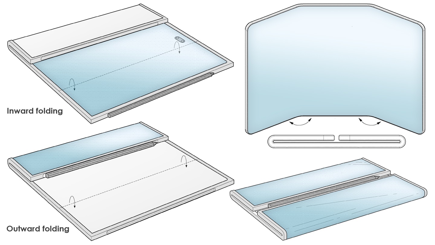 Aceste imagini pe care le puteți vedea în galerie sunt bazate fix pe schița de mai sus, parte dintr-un brevet publicat de către WIPO la data de 21 mai 2021 și care face referire la o tabletă triplu pliabilă, un device multi-pliabil. Un asemenea dispozitiv oferă mai multă flexibilitate în utilizare, cu diferite moduri puse la dispoziția utilizatorului.