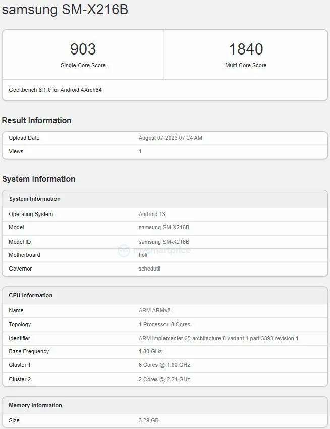 Aflăm că tableta va avea baterie de 5000 mAh cu alimentare la 15W pe fir, jack audio 3.5 mm, Bluetooth și va sosi și în variantă LTE. Dimensiunile sale sunt de 210.7 mm în lungime și 124.7 mm în lățime. Astăzi apare totodată și o listare din GeekBench 6, acolo unde tableta ajunge la 903 puncte single-core, respectiv 1840 puncte multi-core.