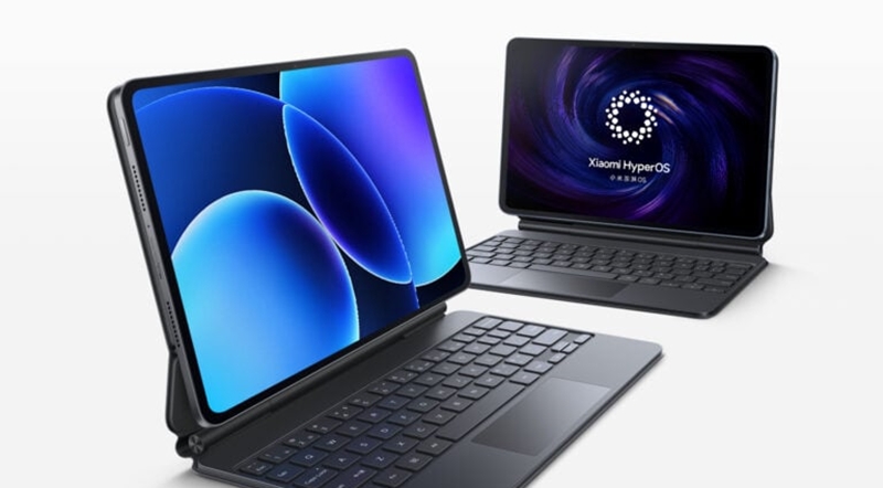 Imaginea de mai sus ne prezintă modelul Xiaomi Pad 8 care vine cu muchii destul de înguste cât să permite o utilizare facilă, cu margini de care să prinzi mâna fără a atinge din greșeală ecranul. Acestea sunt simetrice și mai remarc o construcție metalică unibody, plus un accesoriu tastatură Bluetooth. Apare alături și un stylus pentru interacțiune și desen.