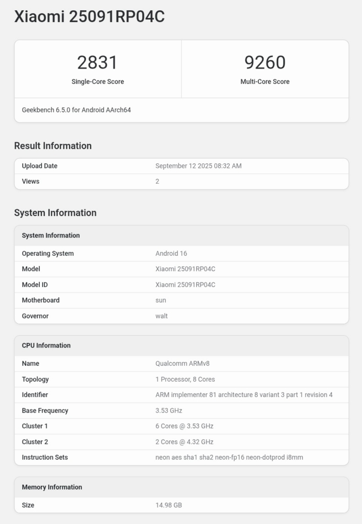 Obține 2831 puncte single-core și 9260 puncte multi-core, scoruri excelente, ca flagship-urile testate de noi pe parcursul acestui an. Alte detalii rămân doar necunoscute pentru moment, dar ce știm este că pe pe 26 octombrie ar urma să debuteze seria Xiaomi 17 cu variantă standard, Pro, Pro Max.