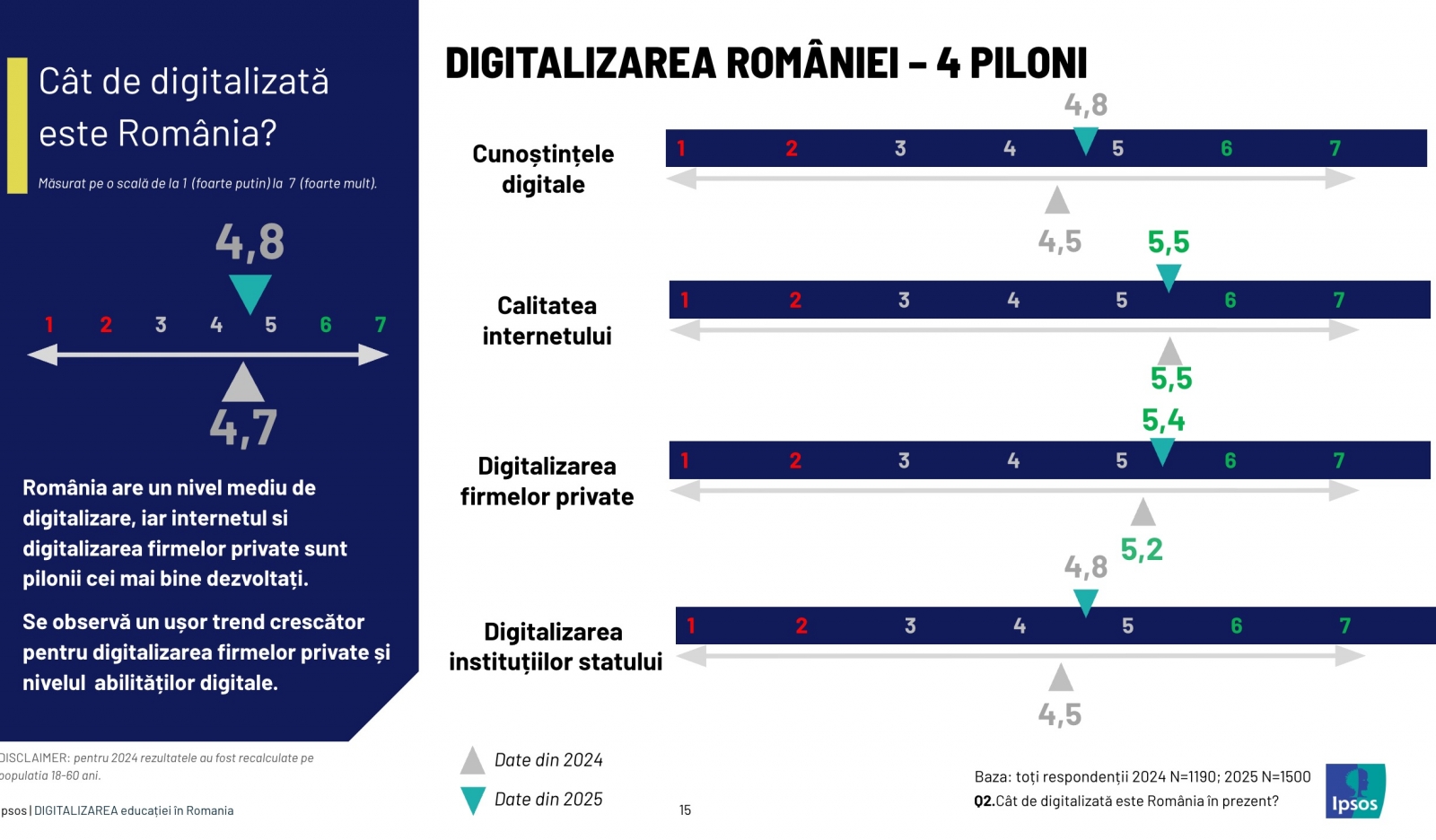 Aproape 3 din 4 români sunt de acord că școala românească trebuie să adopte mai intens tehnologia digitală, potrivit unui nou studiu publicat de Edge Institute, realizat împreună cu Ipsos în august 2025. Chiar dacă procentul celor care consideră digitalizarea „un lucru bun” a crescut la 70% (față de 63% în 2024), percepția generală asupra sistemului de învățământ rămâne critică: școala românească primește o notă medie de 6,7/10, iar digitalizarea sistemului este evaluată cu doar 3,6 din 5.