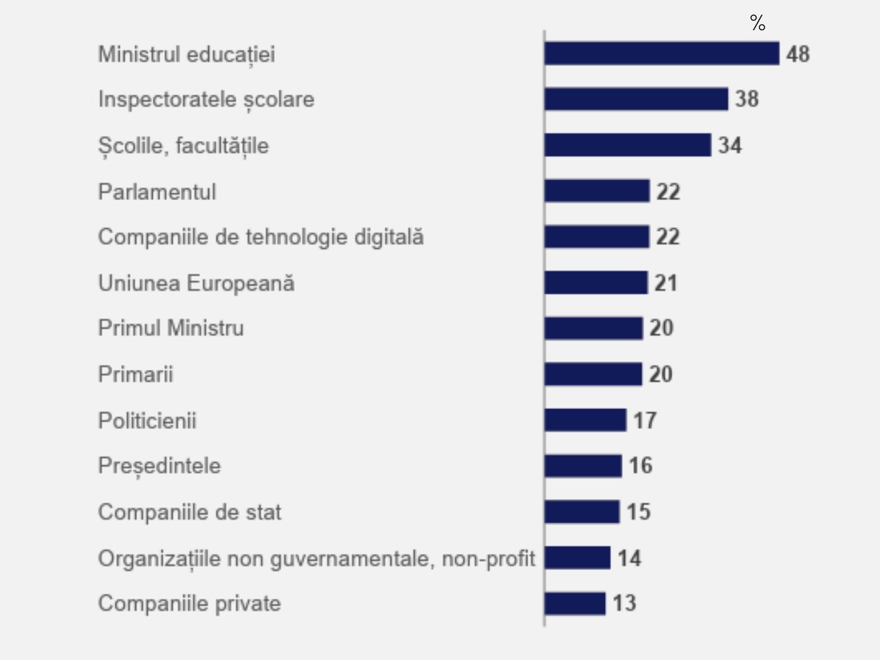 În privința ritmului actual, doar 45% spun că e „adecvat”. Restul fie nu-l percep ca fiind suficient de rapid, fie nu-l înțeleg ca parte a unei strategii coerente. Aproape jumătate dintre respondenți cred că Ministerul Educației ar trebui să conducă acest proces, dar sunt semnale clare că și școlile și inspectoratele trebuie să aibă un rol activ.