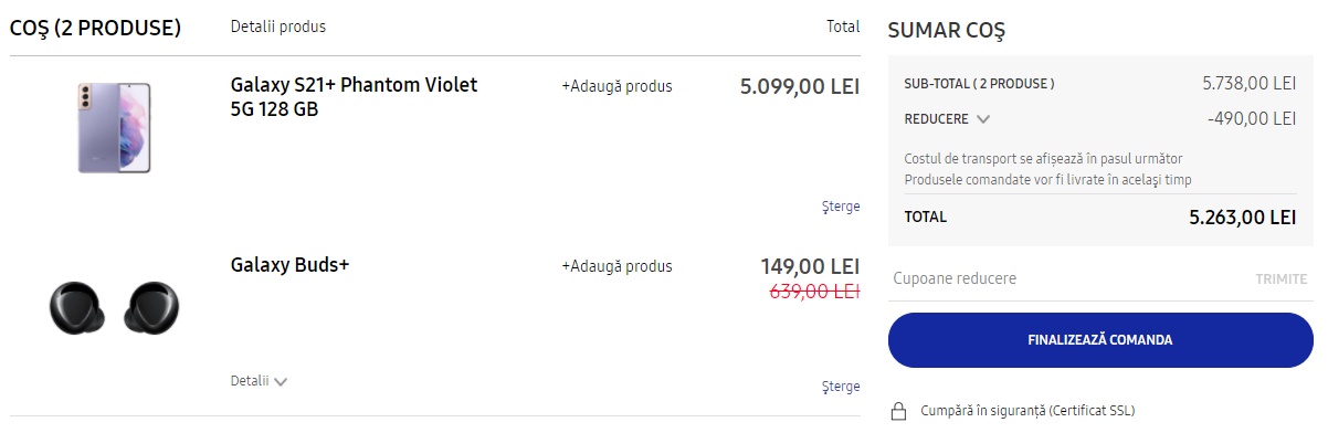Dacă alegi un Galaxy S21+ în varianta cu 128 GB stocare și optezi pentru varianta bundle cu Galaxy Buds+ la pachet, vei plăti în total suma de 5.263 lei (5.099 lei telefonul + căștile 149 lei + 15 lei livrare). Mai multe detalii despre această campanie găsești aici!