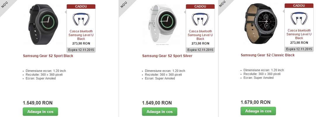Gear S2 Sport - argintiu - 1.549 lei http://www.pcgarage.ro/smartwatch/samsung/gear-s2-sport-silver/ / negru - 1.549 lei http://www.pcgarage.ro/smartwatch/samsung/gear-s2-sport-black/