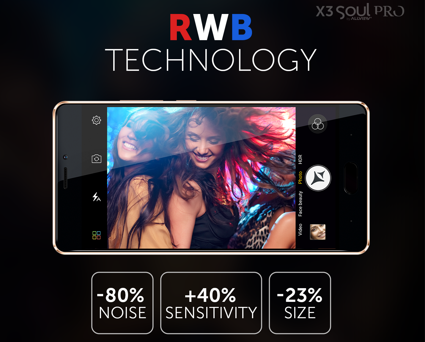 Cu Allview X3 Soul Pro însă, putem scăpa de această grijă și asta datorită implementării unei structuri de tip RWB pentru pixeli (roșu, alb, albastru). Astfel, în comparație cu soluția clasică RGB, noua tehnologie poate reduce cu până la 80% zgomotul din imagine în condiții de iluminare scăzută.