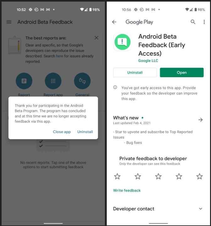 Un motiv probabil pentru care această aplicație primește un update este acela că Google pregătește lansarea unei noi ediții Developer Preview. Aplicația în sine a fost oferită în trecut la pachet odată cu versiuni Android Developer Preview sau release-uri Beta și aflăm că atunci când asemenea programe de test iau sfârșit, apare notificarea referitoare la dezinstalarea aplicației care nu mai are sens să fie păstrată pe telefon.