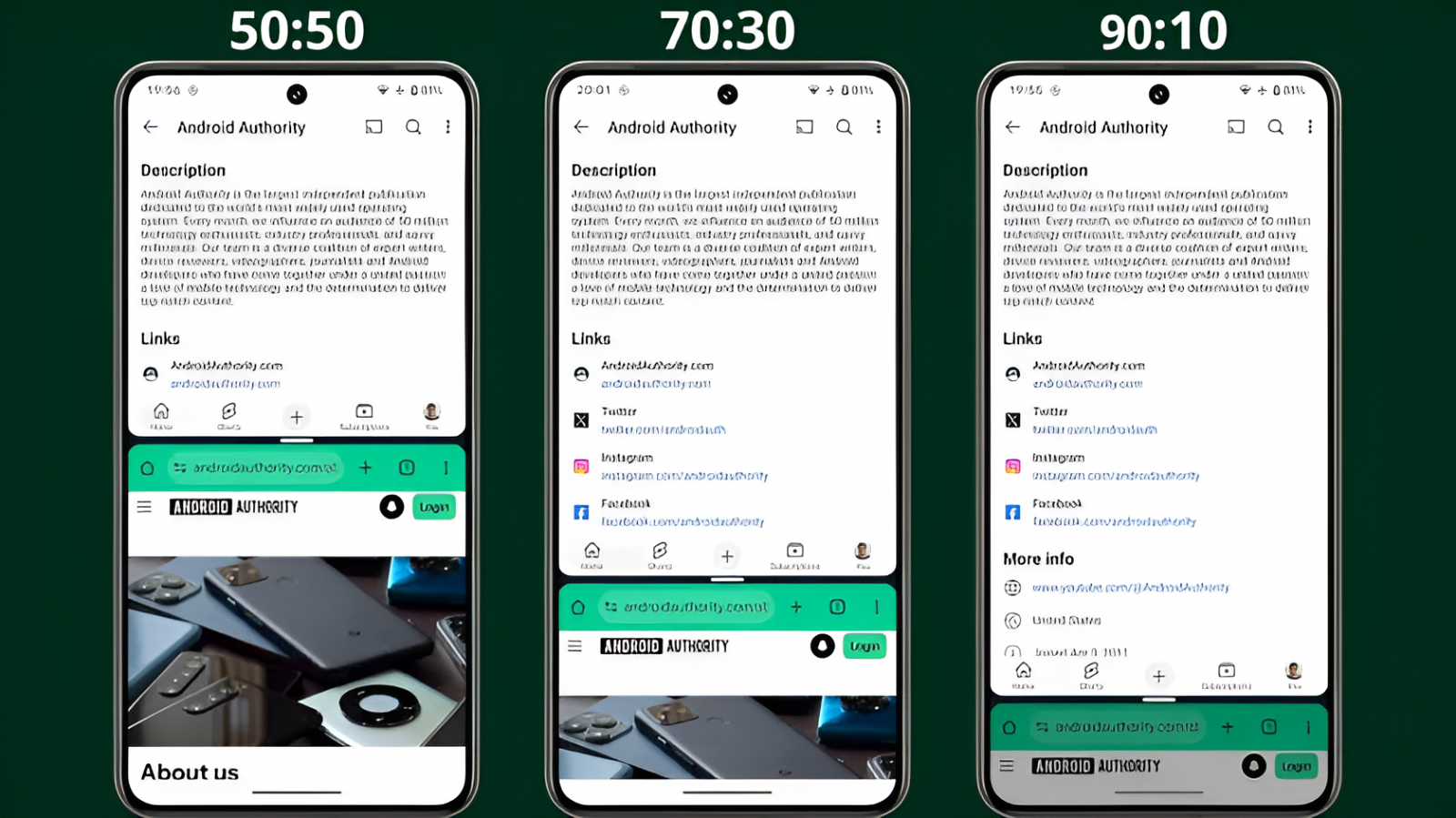 Google testează în Android 16 un nou mod de split-screen care promite să facă multitaskingul pe telefon mult mai practic. Dacă până acum împărțirea clasică era 50:50 sau cel mult 70:30, acum avem un raport 90:10. Asta înseamnă că o aplicație va ocupa aproape tot ecranul (90%), iar cealaltă doar o mică fâșie de 10%. Cea mică rămâne accesibilă și poate fi redimensionată la rândul său, rapid, pentru a ajunge la 90% în raport.