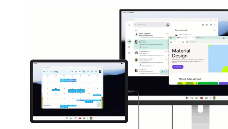 Un detaliu interesant este acela că experiența desktop se extinde și pe tabletele Pixel, dar nu și pe pliabile. Pe o tabletă sesiunea desktop se poate extinde pe ambele display-uri (tabletă + monitor) și poți muta elemente de pe un ecran spre altul, fiind oferit un spațiu de lucru unificat.