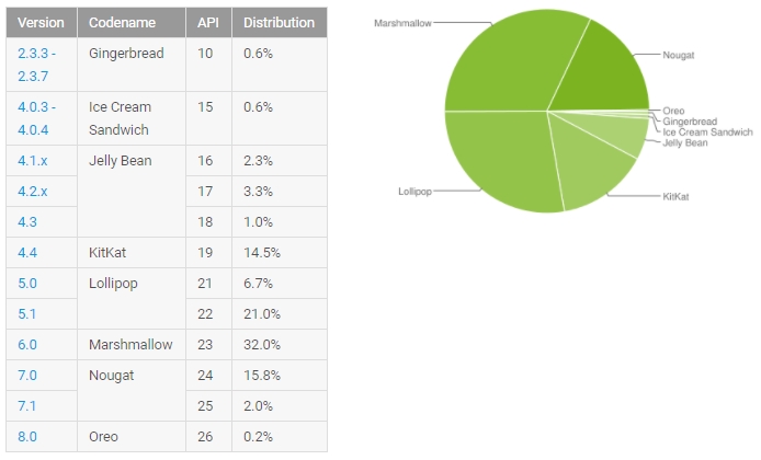 Este o cotă de piață dezamăgitoare și nici măcar AndroidNougat nu se prezintă prea bine ținând cont că a trecut un an întreg de la debutul său comercial. În tot acest interval "nuga" și-a făcut simțită prezența pe doar 17,8% din totalul smartphone-urilor existente la nivel global. Marshamallow se oprește la o cotă de piață de 32%, iar Android Lollipop la 27.7%.