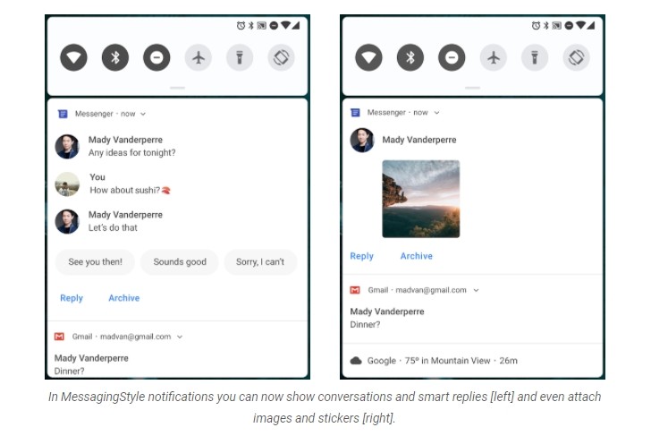Avem şi suport smart reply în tot OS-ul. Mai apare şi o mică modificare la panoul de notificări, cum s-a tot întâmplat la ultimele release-uri Android. Nu ştiu dacă abordarea albă cu toggle-uri gri se va păstra, dar sunt şanse. Apoi tot în acest Developer Preview apare şi un API mulţi cameră, care suportă zoom, Bokeh şi captură stereo nativ, pe terminalele cu două camere în faţă şi spate.