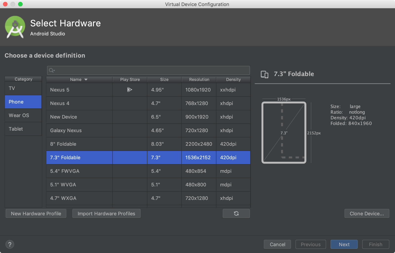 Avem de asemenea și un emulator de pliabile, cei interesați având posibilitatea de a-și vedea aplicațiile sub formă de preview în cadrul Android Studio pe device-uri virtuale cu panouri pliabile de 7.3 sau 8 inch, fiind inclus momentan doar suportul pentru ecranele regăsite pe Huawei Mate X, respectiv Samsung Galaxy Fold.
