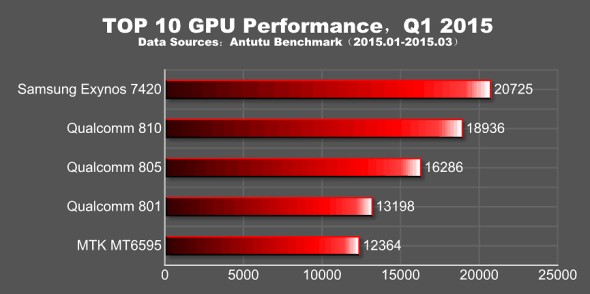 LG G Flex 2 se afla abia pe locul 9, după Nexus 6, Galaxy Note 4 şi Motorola Droid Turbo. În topul procesoarelor, Samsung Exynos 7420 este urmat de Qualcomm Snapdragon 810, cu diferenţa de aproape 2000 de puncte între ele, iar apoi vine Qualcomm Snapdragon 805, cam tot cu 2000 în spatele lui Snapdragon 810. În topul soluţiilor grafice, Exynos 7420 domina iar, datorită puternicului GPU Mali T760, iar pe locul 2 se afla iar Snapdragon 810, urmat de Snapdragon 805.