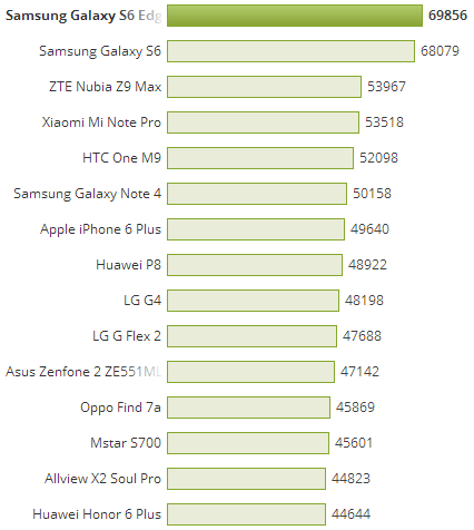 Exynos 7420 pare a fi un hit, având şi cea mai revoluţionară arhitectura de pe piaţă, dacă nu mă înşel. El se afla la interiorul lui Samsung Galaxy S6 şi S6 Edge, plasate pe locul 1 şi 2, deşi în anumite cazuri au existat şi rocade, S6 Edge obţinând un scor mai ridicat. Podiumul e completat de Xiaomi Mi Note Pro, cu procesor Snapdragon 810 şi există şi modele cu procesor MediaTek MT6795 în top 10, dar ele nu sar prea mult de 50.000 de puncte.