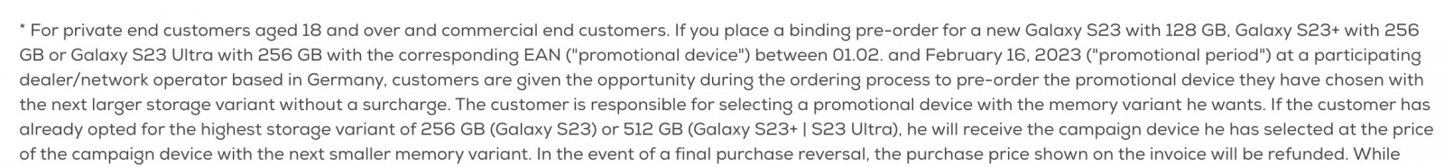 Ceea ce vedeți mai sus face parte din regulamentul campaniei care va avea loc începând din 1 februarie, după debutul seriei Galaxy S23. Conform ofertei, oricine lansează o precomandă pentru Samsung Galaxy S23, S23+ sau S23 Ultra, până pe 16 februarie 2023, va primi o configurație mai bună decât cea dorită. Altfel spus, dacă te afli în Germania și precomanzi un Galaxy S23 cu 128 GB stocare, primești varianta cu 256 GB stocare. La fel se întâmplă și în cazul variantei Ultra, doar că în acel caz crește și memoria RAM, de la 8 GB, la 12 GB.