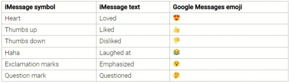 Totuși traducerea acestor emoji-uri nu e tocmai exactă momentan. De exemplu, atunci când un utilizator iMessage reacționează cu „inimă”, acesta apare drept emoji „îndrăgostit” pe telefoanele Android. De asemenea, semnul exclamării pare să fie înlocuit de emoji-ul cu gura căscată, iar semnul întrebării e înlocuit de emoji-ul care „stă pe gânduri”. Funcționează însă reacțiile „like” și „dislike”, acestea fiind afișate corect.