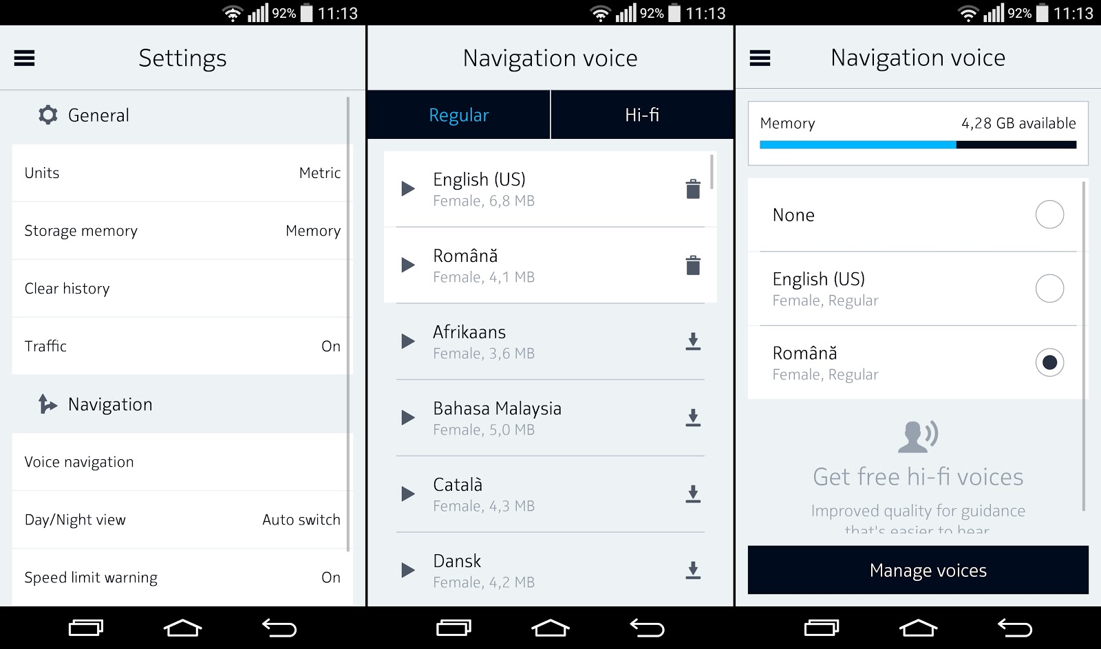 Pentru a realiza acest lucru tot ce avem de făcut este să instalăm noua versiune Here Maps, după care din meniul de setări să alegem Navigare Vocală (Voice Navigation) - Manager Voci (Manage Voices), listă din care vom descărca pachetul cu vocea în limba română ce ocupă 4.1 Mb.
