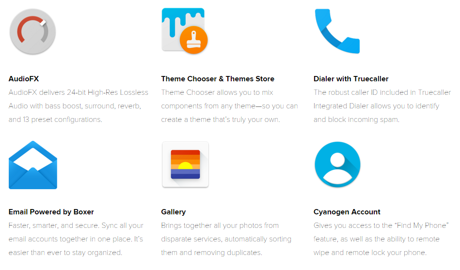 Pachetul în cauză conține următoarele aplicații: Audio FX, Theme Chooser, Theme Store, aplicație de apelare + True Caller, Gallery, dar și o aplicație de email dedicată. Pentru a le putea rula, vom avea nevoie de versiunea CyanogenMod CM 12.1 instalată pe terminalul nostru.