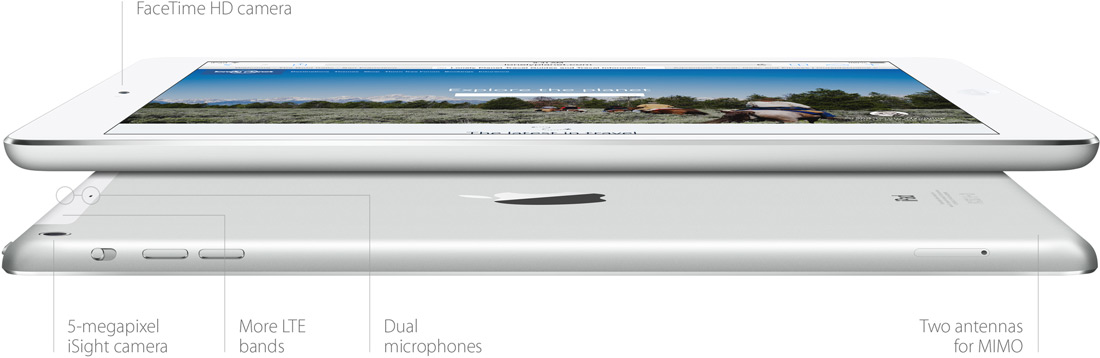 Apple promite 10 ore de baterie, MIMO, o cameră de 5 MP, iar grosimea acestui model este de 7.5 mm, în vreme ce greutatea este de 331 grame. Tableta sosește pe argintiu, alb, gri sau negru cu preț de pornire de 399 dolari și va intra pe piața către finalul lunii noiembrie. iPad Mini pierde 30 de dolari din preț, iar tabletele au parte și de huse din piele, cu prețuri de până la 79 de dolari.